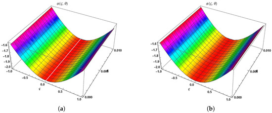 Figure 3 has been divided into two parts: (a) 3D surface solution of Equation (19) at ; (b) 3D surface solution of Equation (20) where and . Figure 4 represents the physical behavior of the mCH model in 2D plot distribution at different fractional order. We divide it into four parts: (a) comparison between the approximate values at and the exact values; (b) comparison between the approximate values at and the exact values; (c) comparison between the approximate values at and the exact values; (d) comparison between the approximate values at and the exact values. We present this comparison at and .