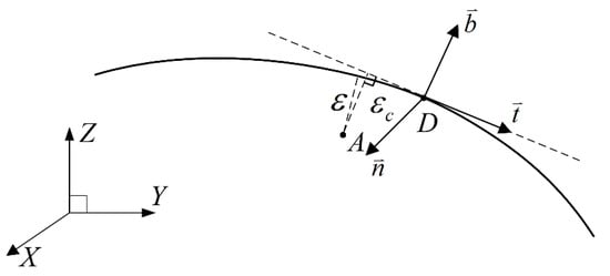The estimated value of the contour error at point can be decomposed into the distance from point to the osculating plane , and the distance from point to the rectifying plane , which could be expressed in the form of: