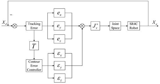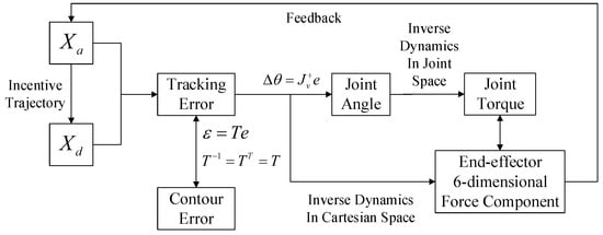 In Figure 7, first, we get the corresponding point on the desired trajectory according to the parameter value of the NURBS curve corresponding to point on the actual trajectory, and the tracking error from point to point could be calculated. The contour error at point D is obtained from Equation (21). Then, the end-effector coordinate frame where the tracking error locates is transformed to the joint space where each axis is located through the inverse kinematics equation of the industrial robot in Equation (22). Next, regarding the joint angle solved from Equation (22) as the input of the inverse dynamics equation in the robot joint space, and the solution of robot inverse dynamics, that is to say, joint torque as the output. At the same time, the inverse dynamics equation in joint space can be transformed to the Cartesian space, that is to say, the tracking error is taken as the input of the inverse dynamics equation. Comparing with the controller in Figure 8 which is proposed in the literature [23], controller in Figure 6, the six-dimensional force component at the end of the output is fed back to the actual trajectory, so that we could realize the closed-loop control of the contour error. Thus, the control accuracy of contour error can be improved.