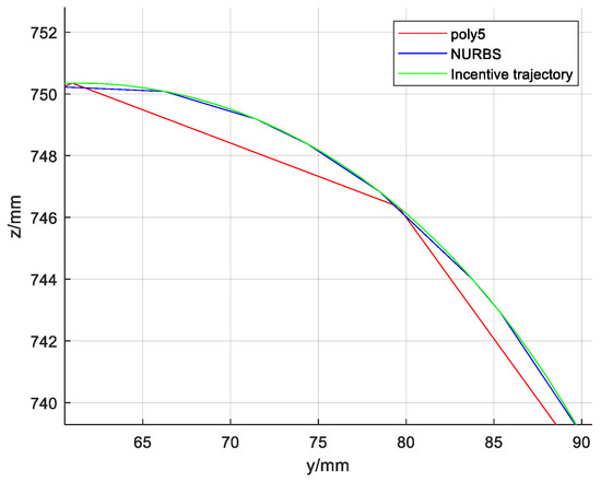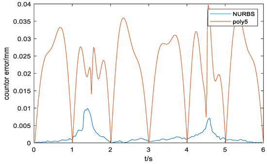 Contour error comparison between the NURBS curve and the five-order polynomial curve.