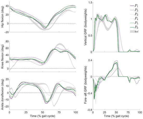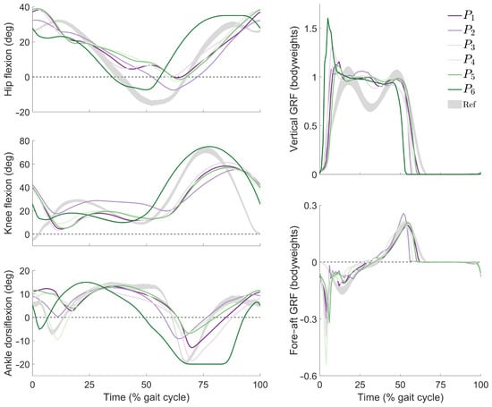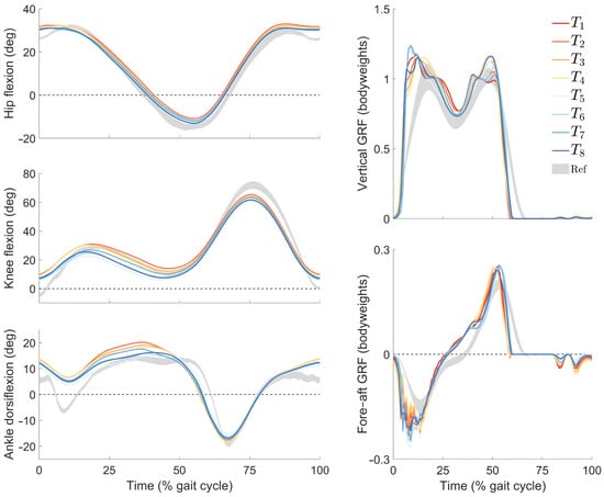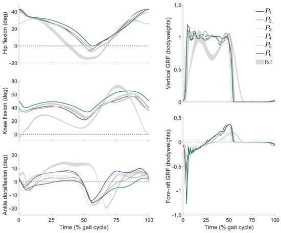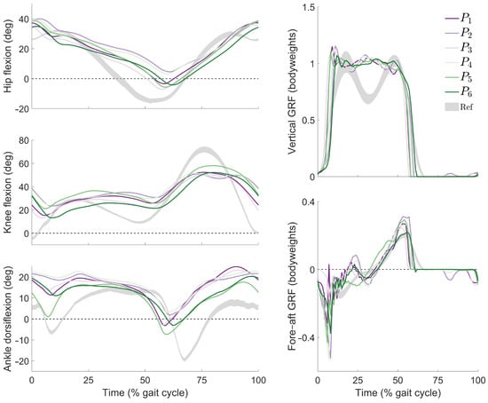 Joint kinematics and ground reaction forces from tracking simulations using cost functions to . (Left) Trajectories of the hip, knee, and ankle joints in the sagittal plane; (right) components of the ground reaction force (GRF) in the vertical and fore–aft directions. For reference, shaded regions (“Ref”) indicate gait patterns within one standard deviation of the mean from a population of healthy adults walking without assistance at similar speeds [].