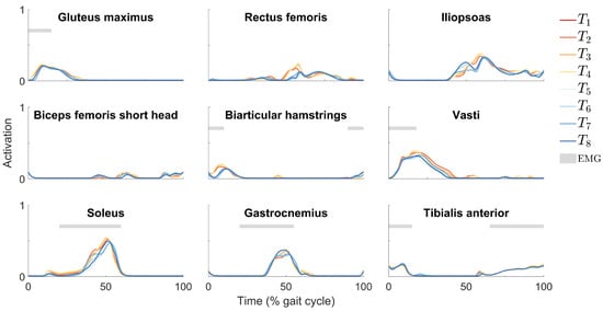 Muscle activations from tracking simulations using cost functions to . (Left) Uniarticular muscles on the posterior side of the leg; (center) biarticular muscles; (right) uniarticular muscles on the anterior side of the leg. For reference, horizontal bars (“EMG”) indicate periods of muscle activity from EMG data of healthy walking (no data were available for the rectus femoris, iliopsoas, or biceps femoris short head) [].