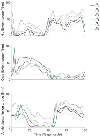 Device torques from predictive simulations of gait using cost functions to . (Top) Hip flexion assistance; (center) knee flexion assistance; (bottom) ankle plantarflexion assistance.