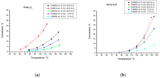Temperature dependencies of the conversion degree of CO oxidation for Pt/Mn2O3 (a) and pure Mn2O3 (b).