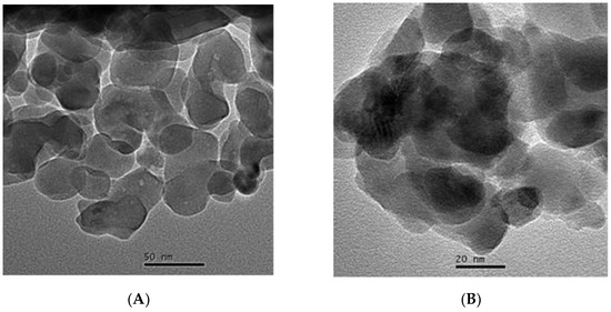 The XRD, IR, TEM data and surface area of as-prepared manganese oxide and after its calcination are discussed in [29]. According to these analyses, the formation of the Mn3O4 phase with tetragonal symmetry was suggested after synthesis following the procedure described above. The particles size is within the range ~15–20 nm and SBET = 76 m2/g. Calcination for 2h at 450 °C leads to the transformation of Mn3O4 into α-Mn2O3 (bixbyite, PDF 01-071-0636). The transformation of Mn3O4 with tetragonal symmetry into α-Mn2O3 is accompanied by an increase in the particle size (30–40 nm) and a decrease in the surface area (20 m2/g) [29]. The form of α-Mn2O3 particles remains spherical (Figure 2A). The platinum loading and next calcination does not further change the manganese oxide phase, its symmetry and structure, surface area and manganese oxide particle size (Figure 2B).