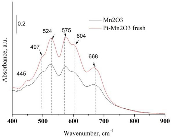 Platinum or platinum oxide was not detected in Pt/Mn2O3 catalysts revealing a finely divided phase of Pt (XRD data are not represented here). Additional information concerning manganese oxide phases were obtained from the infrared spectroscopy. The amorphous components and those with short-range order could be established by means of IR analysis [30]. Figure 3 exhibits the IR spectrum of pure Mn2O3 and Pt/Mn2O3.