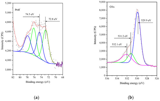 The XPS spectra of the calcined Pt/Mn2O3 sample in the region of Pt4f (Figure 6a) show a peak at 74.6 eV attributed to Pt2+ and another peak at 72.8 eV assigned to Pt(OH)2 [39,40,41]. Obviously, during the calcination, both Pt(OH)2 and PtO are being formed. According to the data for thermal decomposition of [Pt(NH3)4]Cl2 above 320 °C [42], the main decomposition product is Pt0. The formation of platinum in an oxidized state only on the surface of Mn2O3 could be associated with the interaction between the Pt(II)tetraamine complex and the Mn2O3 surface. A similar phenomenon was observed by the deposition of platinum from [Pt(NH3)4]Cl2 on hexaniobate nanoscrolls [43] and Pt on SnO2 [44].