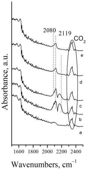 The CO gas is demonstrated by a doublet with a minimum centered at 2142 cm−1 [49]. It is visible that the wing of the CO gas phase at higher wavenumbers overlaps with the band at 2119 cm−1, attributed to the linear CO species adsorbed on Pt1+ [50]. The occurrence of such species was confirmed after CO gas removal by a short purge with nitrogen (Figure 7d,e). Low intensive shoulder at 2080 cm−1 is visible after 10 min in a nitrogen flow as well. It is ascribed to the Pt0−CO species [50].