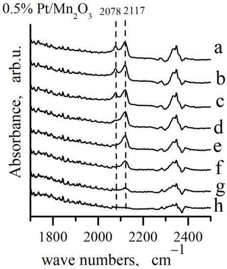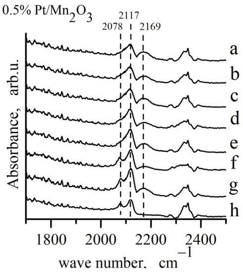 FTIR spectra during oxidation of CO adsorbed on 0.5% Pt/Mn2O3: a–CO adsorption from a flow mixture (4% CO + 10% O2)/N2 at Troom, waiting 67 h at Troom and desorption in: b–10 min N2; c–30 min at Troom in N2 + O2; d–30 min at 50 °C in N2 + O2; e–30 min at 100 °C in N2 + O2 flow; f–30 min at 150 °C in N2 + O2 flow; g–30 min at 200 °C in N2 + O2 flow; h–30 min at 250 °C in N2 + O2 flow.