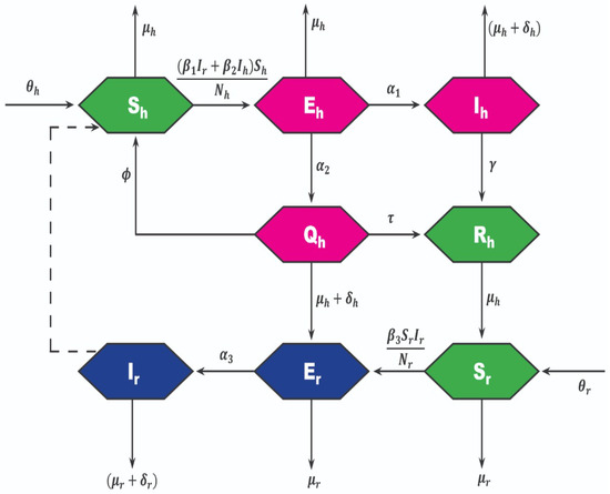 According to model (1), close interaction with infected rodents will result in the spread of the monkeypox virus to humans. The monkeypox virus will not spread to humans if the infected rodents do not infect any humans. As a result, if falls to zero in (1), there are no suspected, exposed, or infected human populations. As a result, this model will reduce to the SEIQR model.