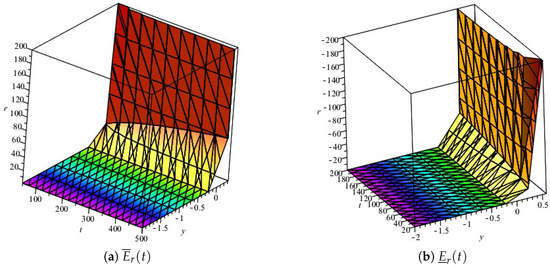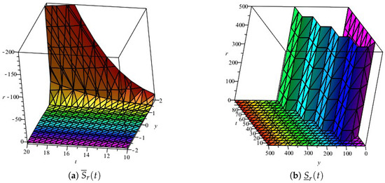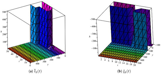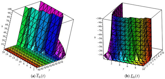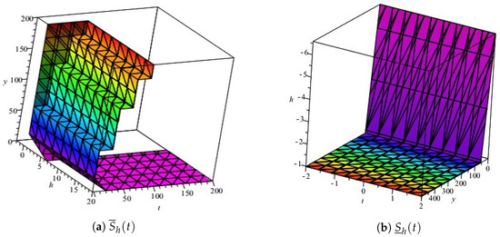 The spread of transmission of monkeypox virus is shown in Figure 2, Figure 3, Figure 4, Figure 5, Figure 6, Figure 7, Figure 8 and Figure 9 using the fuzzy fractional order at . It also finds the solution for the following Equations (25)–(32). The existence of solutions is guaranteed by w-monotunity conditions (refer [39,40]).