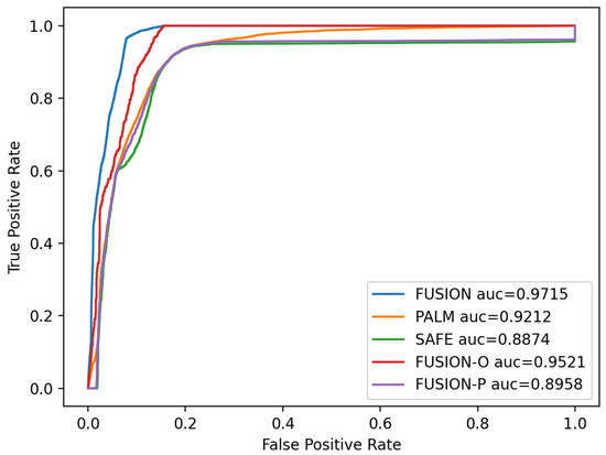 Because the binary similarity measurement can be considered as a binary classification problem, we used relevant metrics in our evaluation. In particular, since there is no general threshold to discrete the similarity score, the chosen thresholds largely determined the model’s predictive performance. To avoid the potential bias introduced by a specific threshold value, we considered the receiver operating characteristic (ROC) curve, which measured the model’s false positives/true positives under different thresholds. The horizontal and vertical coordinates of the ROC were the false positive rate (FPR) and true negative rate (TNR), which are calculated as: