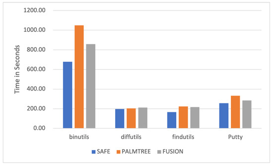 Figure 5 shows the results. In general, FUSION is on par with the two state-of-the-art baselines in terms of efficiency. Moreover, we found that SAFE takes the least time to finish tasks. However, as discussed above, SAFE has the worst performance. In the meanwhile, PALMTREE is the least efficient in general. However, this does not make it the most effective. FUSION is better (or on par with) PALMTREE in terms of efficiency, but it performs better than PALMTREE. To summarize, these findings demonstrate that FUSION can balance efficiency and performance, and provide one efficient SOTA solution to the binary similarity measurement task.
