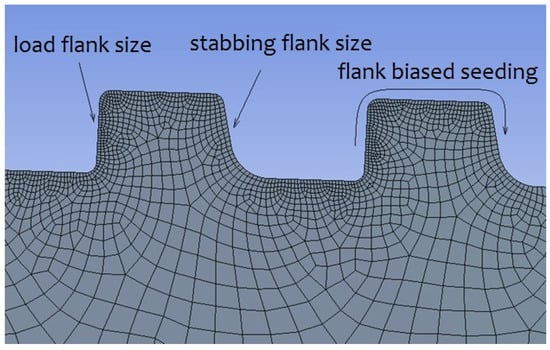 Once the CAD model for the premium connection analysis had been prepared, the FE Mesh could be generated using finite element modeling. Five parameters define the FE Mesh: global size, local size, load flank size, stabbing flank size, and flank element count, as shown in Figure 7. The quad element is predominantly employed for 2D analysis.