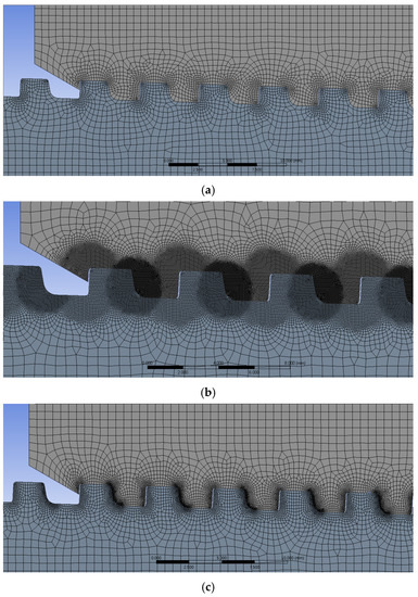 The round mesh approach has the drawback of extending the analysis time by constructing meshes that are too fine at the thread boundary where the actual stress is concentrated, as well as in areas where extensive studies are not needed. Therefore, finite element modeling was carried out utilizing the line mesh function, which can build only fine meshes around the thread borders. To generate the mesh, as shown in Figure 8c, the global mesh size, which represents the overall size, was set to 0.6 mm, while the local mesh size of the thread component was set to 0.1 mm. Then, using a line mesh, the mesh size for the stabbing flank was set to 0.03 mm, while the mesh size for the load flank was set to 0.05 mm in the pin part. In the box section, the mesh size for the stabbing flank was set to 0.05 mm and the mesh size for the load flank was set to 0.08 mm.