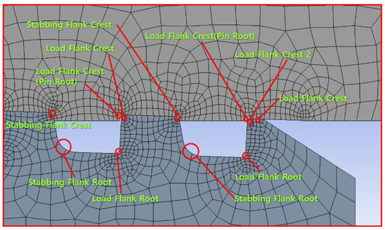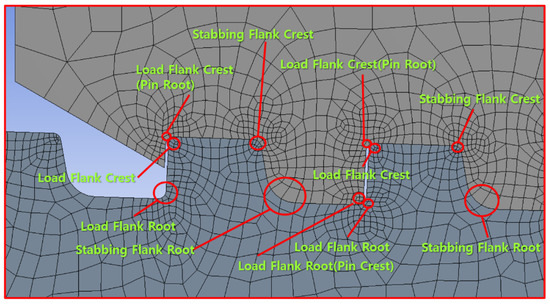 The name of each component corresponding to the LET (last engaged thread) portion of the pin is depicted in Figure 10. Pin root, load flank crest, and stabbing flank crest were allocated to the upper corner section of pin thread # 1 (pin LET), whereas the load flank root and stabbing flank root were assigned to the bottom corner parts. Stabbing flank crest, load flank crest, and load flank crest (pin root) are similarly assigned to the upper corner of pin thread # 2.
