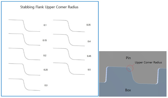 Since the most concentrated stress is mostly delivered to the corner portion, as demonstrated by the outcome of the previous study, the angle of the stabbing flank was set to 13 degrees to obtain a better result, and the upper corner radius was modified accordingly. Originally, the upper corner radius measured 0.2 cm. In order not to diverge from the original standard, the variation in the von Mises stress was investigated by adjusting the upper corner radius of the stabbing flank from 0.1 cm to 0.5 cm in 0.05 cm increments, as illustrated in Figure 12.