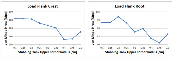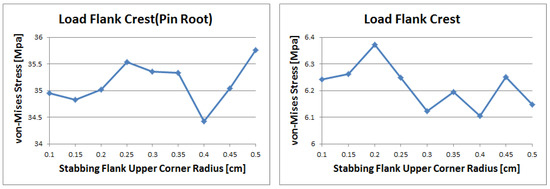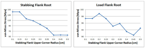 In the case of the load flank crest, as shown in Figure 14, the stress gradually decreased as the radius increased. The maximum value was observed at 0.1 to 0.2 cm, while the minimum value was at around 0.4 cm. In the case of load flank root, the value was irregular. However, the trend is similar to the load flank crest, decreasing stress according to an increasing radius. The maximum value appears at 0.2 cm and the minimum value is at 0.45 cm.