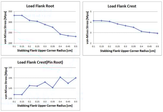 Stabbing flank comparison of von Mises stress changes with upper corner radius; the load flank crest (pin root) portion (upper left), the load flank crest portion (upper right), and the stabbing flank root portion (lower left) of Pin Thread 1 (Pin LET).