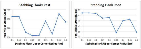 In the case of load flank root, the stress values increase and decrease repeatedly, as expressed in Figure 22. The highest stress recorded was 600 MPa, while the lowest was 575 MPa. In the case of the stabbing flank crest, the stress remained around 300 MPa for radii from 0.25 to 0.5 cm. The stress value likewise abruptly declined at 0.15 cm, as can be observed. The highest stress recorded was around 560 MPa. The stress value for the stabbing flank root remained the same at around 123 MPa, as can be seen.