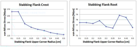 Stabbing flank comparison of von Mises stress changes with upper corner radius; the load flank crest part (left), and the load flank root part (right) of box thread 1 (box LET).