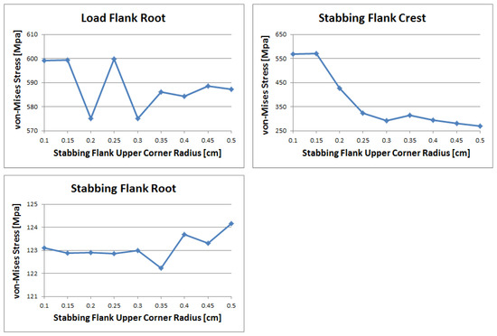 Selection of stabbing flank upper corner radius optimal value by stress size (top 3, lower 3).