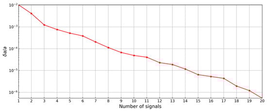We further study the influence of the combination of GW signals on the parameter estimation accuracy. Here, we take parameter as an example to present the data processing. Firstly, we assume that there are n X-MRI systems at the GC. Then, we calculate the Fisher matrices of all these signals to determine the diagonal element . We sort the value of by the order of size, and the corresponding matrix will be . Then we add these matrices to obtain the matrix ,