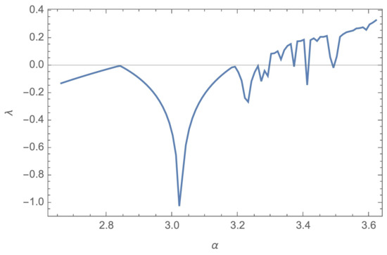 Regarding the ranges for both keys ( and ), both are to be chosen such that for every in the sequence, the range should remain . Starting by the lower limit, the 0 is avoided as , which will result in, once a 0 appears in the sequence, all remaining values in the sequence will become 0. When it comes to the upper limit, given that the function in a tan variant, is to be avoided as . Moreover, plotting the tan curve, starting from 1 till , the curve slope starts to be steep (in other words, with a tangent slope greater than 1). The main effect of this is that the rate of increase in tan values, given small steps in input, starts to be harder to limit (as it approaches infinity). As per that, initiating the value of , the range is considered optimal (for this scenario) as . According to the range, regarding the scale factor , for a chaotic behaviour, the range is . This is confirmed visually through plotting the bifurcation diagram and Lyapunov exponent, in Figure 1 and Figure 2, respectively.