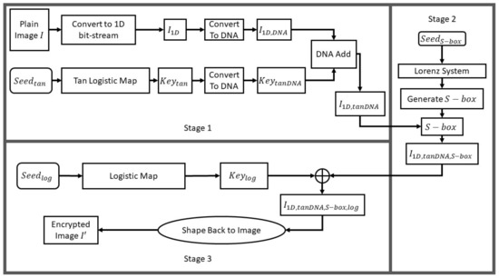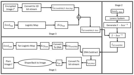 After performing the 3 stages, reshaping back into a 2D image (of dimensions ) results in the encrypted image . Figure 6 demonstrates a flowchart for the encryption procedure.