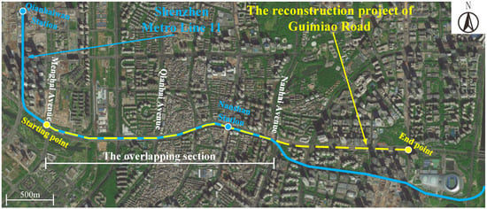 The section between Nanshan Station and Qianhaiwan Station of Shenzhen Metro Line 11 starts from the intersection of Guimiao Road in the east, passes under Guimiao Road to the west and finally reaches Qianhaiwan Station, with a total length of 3.63 km. The interval section of the metro tunnel overlaps with the underpass tunnel involved in the reconstruction project of Guimiao Road, and the overlapping section is located between Nanhai Avenue and Menghai Avenue, with a length of 2.96 km. The plan view of the overlapping section is shown in Figure 1.