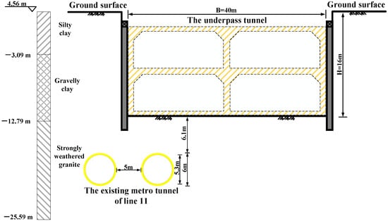 In the overlapping section, the underpass tunnel is located on the side above or directly above the existing metro tunnel with a minimum clear distance of only 6.1 m. Figure 2 shows a typical design cross section of the metro tunnel and the underpass tunnel. The construction sequence of the overlapping section is to construct the metro tunnel of Line 11 by the shield method [], and then to construct the underpass tunnel of Guimiao Road by full width open cut method []. In fact, this project is a longitudinal excavation of overlapping foundation pit above the existing metro tunnel, which has the characteristics of large unloading range and complicated geological conditions and surrounding environment. During the construction process, strictly controlling the influence of foundation pit excavation on the existing metro tunnel is another important feature of this project.