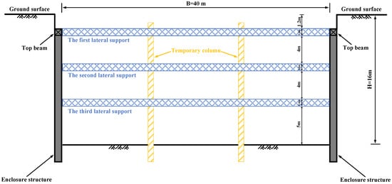 The whole foundation pit is excavated symmetrically by the open cut method in the principle of vertical layering and longitudinal segmentation. The main construction steps are as follows: initially, bored piles, crown beams and other enclosure structures are symmetrically constructed; after the excavation reaches the bottom of the first to third support, the lateral support is immediately constructed; finally, the excavation reaches the bottom elevation of the foundation pit and the concrete base slab is poured.