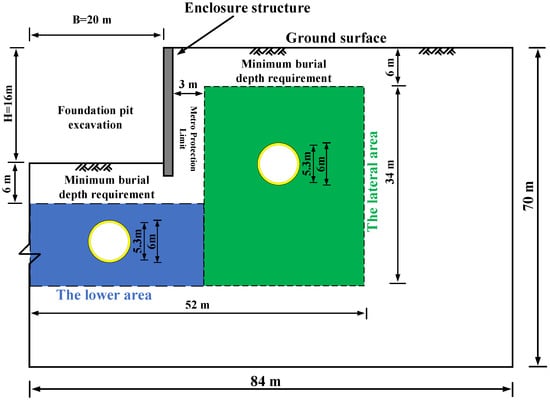 This paper highlights the deformation characteristics of the existing metro tunnel at different locations outside the foundation pit after the unloading effect of overlapping foundation pit excavation; therefore, the distribution range of the affected area of the tunnel outside the foundation pit needs to be determined. No underground construction activities can be carried out within 3 m on both sides of the metro line, so the metro tunnel is placed within 3 m outside of the enclosure structure. The shield tunnel buried depth should not be less than 1 times the tunnel outer diameter (about 6 m), so the tunnel is placed at 6 m below the ground surface and the bottom of the foundation pit. According to the study of Deng et al. (2014) [], the influence range of soil horizontal deformation in the lateral area of the foundation pit is concentrated in the outer part of the enclosure structure twice the excavation depth, which is taken to 32 m beyond the enclosure structure in this paper. The burial depth of the tunnel in the actual project rarely exceeds 40 m, and the maximum burial depth of 40 m is taken as the center of the tunnel in the study. In summary, the affected area of the tunnel outside the pit is drawn with a dashed line in Figure 4 and marked with the corresponding dimensions. In addition, the affected area of the tunnel can be divided into a lower area and a lateral area according to the relative position of the tunnel to the foundation pit.