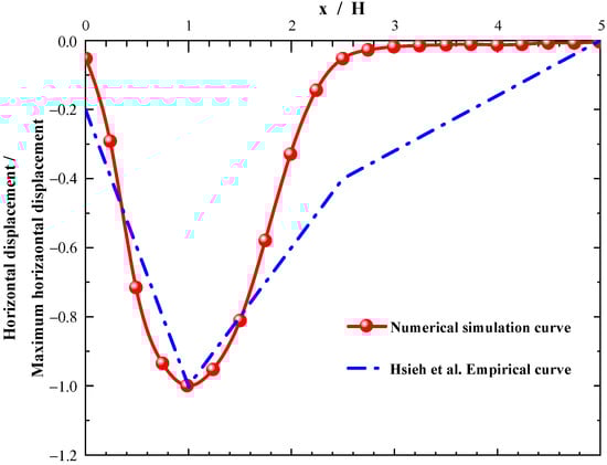 The horizontal displacement curves of the ground surface outside the foundation pit derived from numerical simulation and empirical formula are given in Figure 5. Considering the excavation depth of the foundation pit as H and the horizontal distance from the ground surface to the enclosure structure as x, the horizontal coordinate is x/H. Schuster et al. (2009) [] concluded that after the excavation of the foundation pit, the horizontal displacement of the ground surface at the distance of 1H from the enclosure structure reaches the maximum value. The horizontal displacement of the ground surface decreases rapidly in the range of 1H–2.5H, and decays to 0.4 times of the maximum value at 2.5H. The horizontal displacement of the ground surface gradually converges to 0 in the range of 2.5H–5H. It is obvious that although the range of the main influence zone derived from the numerical simulation is smaller than that of the empirical curve, the trends of both are basically similar.