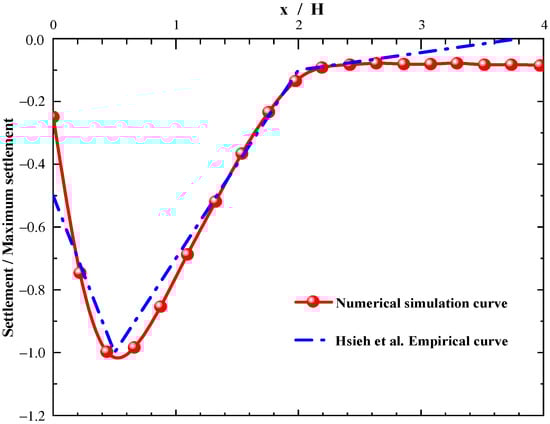 Hsieh et al. (1998) [] found that after the excavation of the foundation pit, the main influence of surface settlement was concentrated within 2H outside the enclosure structure. The surface settlement reaches the maximum settlement value at 0.5H, and the surface settlement outside the 4H range is approximately 0. Figure 6 shows the surface settlement curves outside the foundation pit from the numerical simulation and the empirical formula. It is obvious that the distribution laws of the surface settlement curve obtained from the numerical simulation and the empirical curve are basically consistent. Both the location of the maximum settlement value and the range of the settlement trough can be fitted well.
