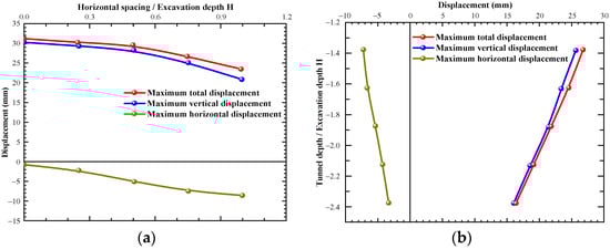 The tunnel displacement variation curves in the lateral area: (a) Variation with horizontal spacing; (b) Variation with tunnel depth.