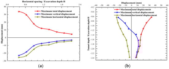 The tunnel displacement variation curves in the lower area: (a) Variation with horizontal spacing; (b) Variation with tunnel depth.