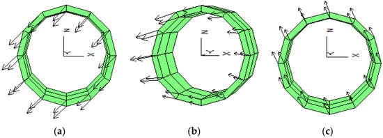 Figure 8 shows the displacement vectors of the tunnel nodes in the lower area when the depth of tunnel is maintained at 22 m and the horizontal spacing between the center of the tunnel and the center of the foundation pit is 0 m, 8 m, and 16 m, respectively. The upward vertical displacement occurs at the crown and bottom of tunnel, which indicates that the tunnel in the lower area has experienced different degrees of overall uplift displacement, and the horizontal displacement direction all points to the center of the foundation pit. Moreover, with the increase of horizontal spacing, the tunnel structure will rotate.