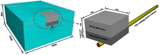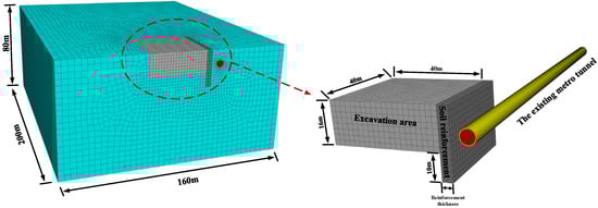 Numerical model dimensions are taken as follows for the case when the tunnel is in the lower area. We assume that the metro tunnel is located directly below the center of the foundation pit with a vertical clear distance of 12 m. The reinforcement range covers the bottom area of the foundation pit. The length L, width B, and depth H of the foundation pit were taken as 80 m, 40 m, and 16 m, respectively, and the outer diameter of the metro tunnel is 6.0 m and the thickness of the segments is 0.35 m. Since the model has symmetry about the length direction of the foundation pit, half of the model is taken for numerical simulation. The length, width, and depth of the adopted model were taken as 160 m, 200 m, and 80 m, respectively. Moreover, the constitutive models and related parameters for the soil, reinforced soil, tunnel segments, enclosure structure and lateral supports are shown above. The lateral boundary condition of the model is fixed along the normal direction, the bottom boundary is completely fixed, and the top of the model is set as a free boundary, which is shown in Figure 11.