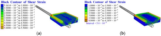 Shear strain distribution of soil lying under the foundation pit: (a) Without reinforcement; (b) With reinforcement.