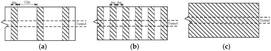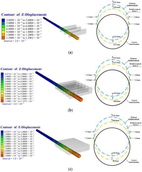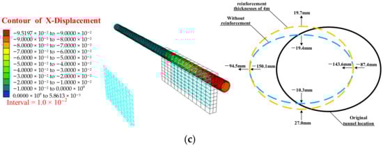 Influence of different reinforcement thicknesses of reinforcement on tunnel in the lateral area: (a) Without reinforcement; (b) Thickness of 2 m; (c) Thickness of 4 m.