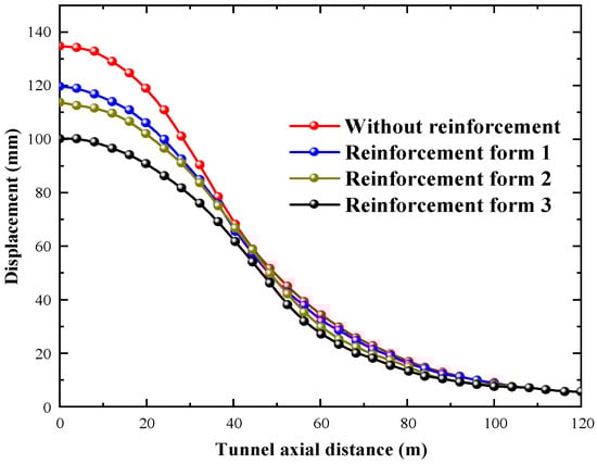 Figure 16 shows the vertical displacement distribution of the tunnel under the three forms of reinforcement and compares the displacement with that of the case without reinforcement. Compared with the case without reinforcement, all three forms of reinforcement can reduce the vertical displacement of tunnel to different degrees, among which the full-area reinforcement form has the most obvious effect on controlling the deformation of tunnel.