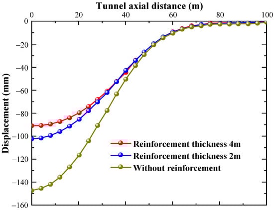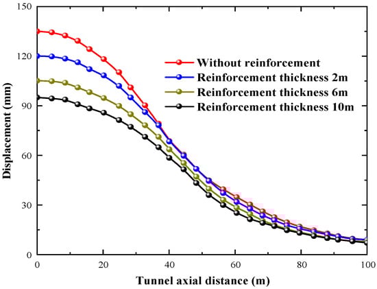 Finally, the reinforcement thickness is an important factor affecting the performance of the reinforcement. In general, the greater the reinforcement thickness, the more obvious the effect of controlling tunnel deformation, but also the higher the project cost. To investigate the law of reinforcement thickness on controlling deformation of tunnel, taking the reinforcement form of full-area reinforcement as an example. Figure 18 gives the longitudinal distribution curves of the tunnel uplift in the lower area under different reinforcement thicknesses. It is obvious that, compared with the case without reinforcement, the maximum vertical displacement of the tunnel in the lower area is reduced by 11.1%, 22.1%, and 29.2% when the reinforcement thickness is 2 m, 6 m, and 10 m, respectively, and the impact area of the tunnel uplift is also reduced.