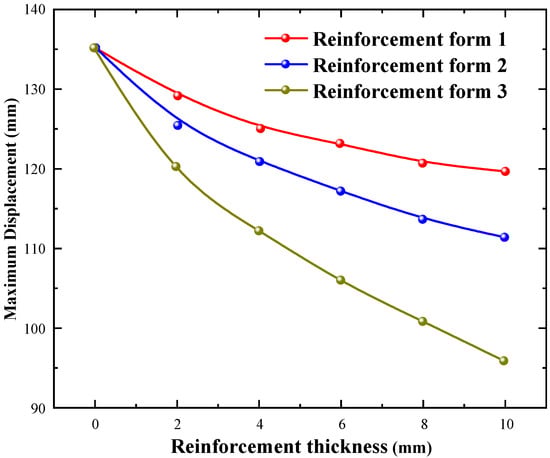 The variation of the maximum vertical displacement of tunnel with the reinforcement thickness for different reinforcement forms.