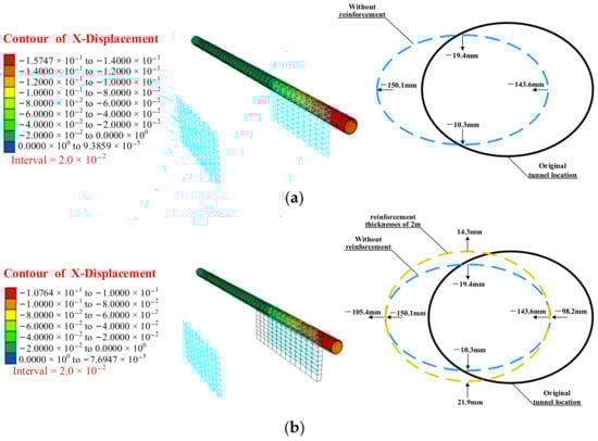 Figure 21 shows the horizontal displacement distribution of the tunnel without reinforcement and with reinforcement thickness of 2 m and 4 m, respectively, and compares the displacement with that of the case without reinforcement. As the tunnel is in the settlement zone, without reinforcement, both the crown and bottom of the tunnel settle, while after the soil reinforcement is applied, both the crown and bottom are transformed from settlement to uplift. The reason for this situation is that the depth of the reinforced soil is large and it has penetrated deep into the uplift zone below the bottom of the foundation pit, which makes the stiffer reinforced soil move upward with the soil in the uplift zone, thus driving the adjacent tunnel to uplift. Therefore, properly deepening the reinforced soil can offset the settlement of the tunnel in the settlement zone.