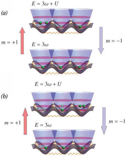 Let us consider the schematic representation of Figure 1 to illustrate integer and fractional resonance conditions better. Here, we display a schematic representation of many-body resonances in the driven lattice model. In Figure 1a, we show two configurations with all particles (green circles) occupying a lattice site and the leftmost site occupied by two particles. The energy difference between these configurations is . Therefore, to evolve from the lower to the upper configuration, one needs to activate a hopping event with frequency to increase the system energy. In Figure 1b, we show configurations that involve two hopping events where the leftmost particle moves to the rightmost lattice site. The energy difference between these configurations is , so each hopping event increases the system energy by a .