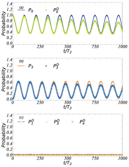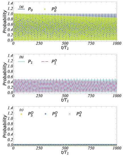 Let us consider a three-site Bose–Hubbard lattice. We will present results about the stability of the emerging many-body dynamics when considering integer () and fractional () resonance conditions in an open system scenario. Our study involves the numerical solution of the Lindblad master Equation (6) by using the fourth-order Runge–Kutta algorithm. We consider a product state with unit filling as an initial condition. In a closed system scenario, the system will only populate states within the positive parity subspace , , , , , [38]. In an open quantum system scenario, we expect that U(1) symmetry will no longer be preserved. Our model will consider identical loss mechanisms for each lattice site, implying parity symmetry is still held.