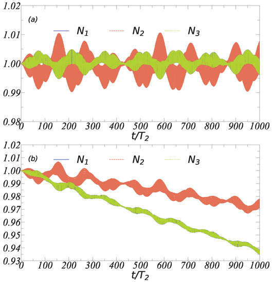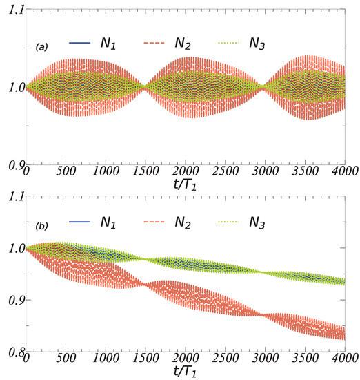 We plot the average occupation number for each lattice site, for the integer resonance . The upper panel (a) shows the closed system scenario. The lower panel (b) shows the open system scenario. As in previous numerical simulations, the three-site Bose–Hubbard lattice is initialized in the state . We use realistic parameters GHz, MHz, kHz, kHz, kHz, kHz, kHz, kHz. We consider up to particles per site with a local Hilbert space dimension .
