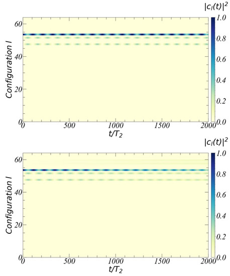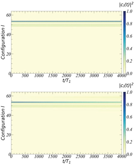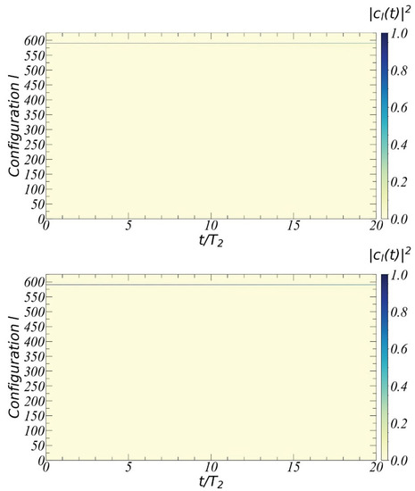 When considering noisy dynamics, the U(1) symmetry is broken, and the system could populate states outside the unit-filling subspace. In this case, the wave function may be written as a linear combination of all possible configurations , with for a fixed number of sites L. Therefore, it is necessary to compute the probability of all accessible configurations the system may visit along with its dynamical evolution. In the three-site Bose–Hubbard lattice, there are accessible configurations. Figure 6 shows the distribution of populations of each configuration for the integer case . The upper panel shows the system dynamics considering a closed system, whereas the lower panel is an open system scenario. In the long-time dynamics, a fraction of configurations outside the unit filling subspace start to be populated; however, signatures of the stability of the integer resonance are visible in the average occupation number shown in Figure 4. In analogy, Figure 7 shows the distribution of populations of each configuration for the fractional case . The upper panel shows the system dynamics considering a closed system, whereas the lower panel is an open system scenario.