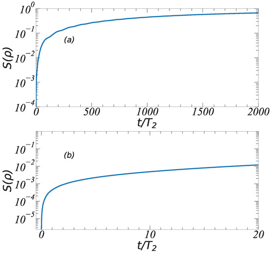 Another way to characterize the stability of the system under noisy mechanisms is by using the linear entropy defined as , where is the system density matrix. In a closed system scenario, the linear entropy at all times because is a pure state. However, a realistic situation will necessarily imply the density matrix to be a statistical mixture. In the previous section, we demonstrated that the fractional many-body resonance and its characteristic slowing down of the dynamics [38] is a stable phenomenon under loss mechanisms. The latter is also reflected in linear entropy as shown in Figure 9, where the upper (lower) panel shows the linear entropy as a function of time for a lattice of () sites. In both cases, is is less than 1 within the simulating time.